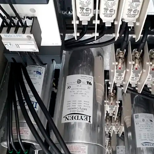 Comandados por un regulador automático LEYDEN de 6 o 12 pasos totalmente electrónico y con indicadores luminosos, comandado por microprocesador programable.